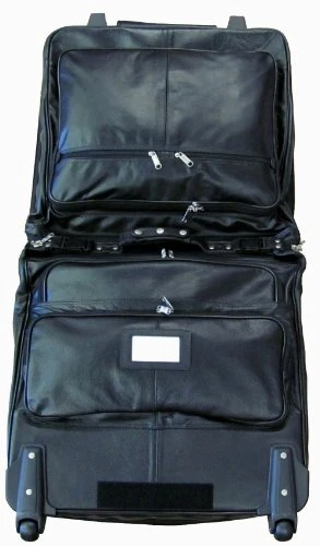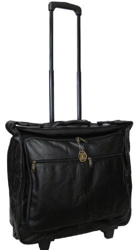Details: Pack suits, dresses, and other hanging garments neatly inside this wheeled garment bag from AmeriLeather. The AmeriLeather Wheeled Leather Garment Bag is crafted from top grain cowhide leather and features a book-opening design that makes it easy to pack and a telescopic handle and corner mounted wheels that make it easy to maneuver. This garment bag has a fully lined interior with hanging brackets and includes two plastic hangers, cross straps to hold garments in place, and an inner cover with two large zippered pockets to hold belt, ties, socks, and undergarments. Exterior zipper pockets offer added storage for toiletries, accessories, and personal items that you need to keep within easy reach.