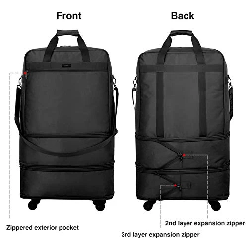 Foldable and Expandable Design: This luggage can be folded when you don’t use it, foldable dimension is 17.72” x 10.24” x 4.72”(L*W*H), just take up little space. You can also expand it from 17.72” x 10.24” x 19.69” to 17.72” x 10.24” x 31.49, expand the capacity from 55.99L to 100L.