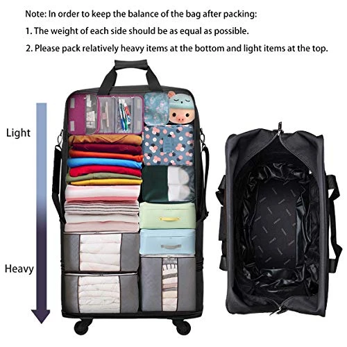 - EASE OF MOBILITY: Four spinner wheels makes for easy control and movement, suit for all kinds of road conditions. When it’s fully extended, please pack large but light stuff at the top, such as shoes, coats and blanket.
