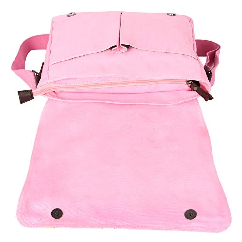- Messenger bag with 6 pockets, 1 main pocket enough for holding 12″ 13″ small laptop or tablets or books , 1 pocket with zipper on the flap, 2 side pockets, and 1 back pocket