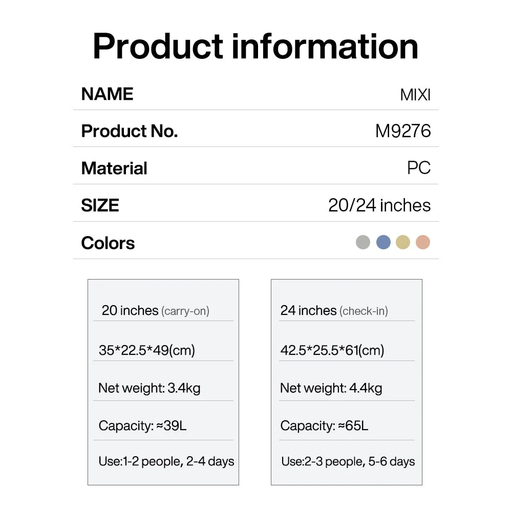 | Luggage Size | 20", 24" |